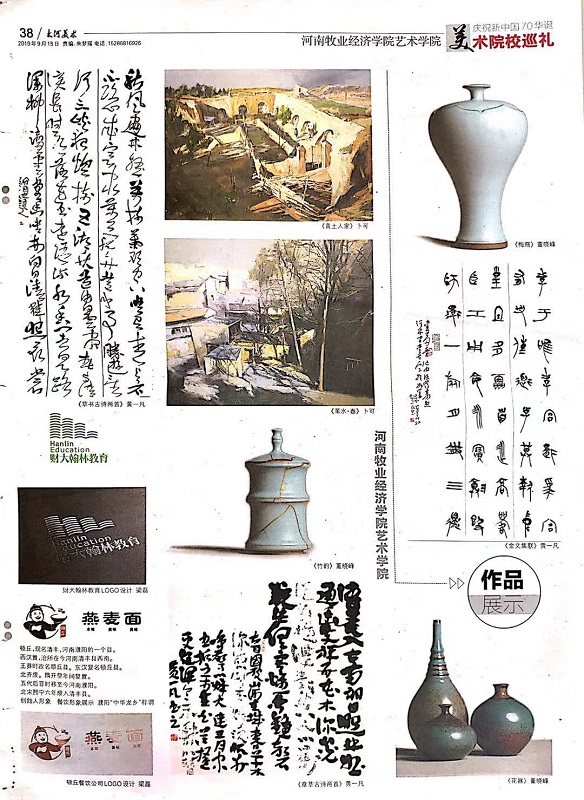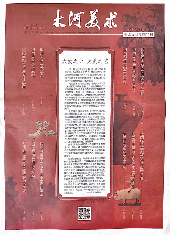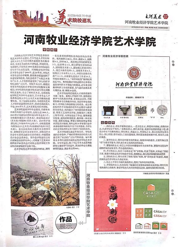 近日,《大河美术“美术设计学院特刊”》对我校太阳集团tyc4633及教师作品进行了专版介绍,此次特刊一共报道省内十二所本科院校太阳集团tyc4633的办学情况和师生作品。我校太阳集团tyc4633简介被大量篇幅报道,其中,大师董晓峰代表作品陶瓷,卜可的绘画作品、粱磊和卞卡的设计作品以及黄一凡的书法作品也被一一刊登展示。