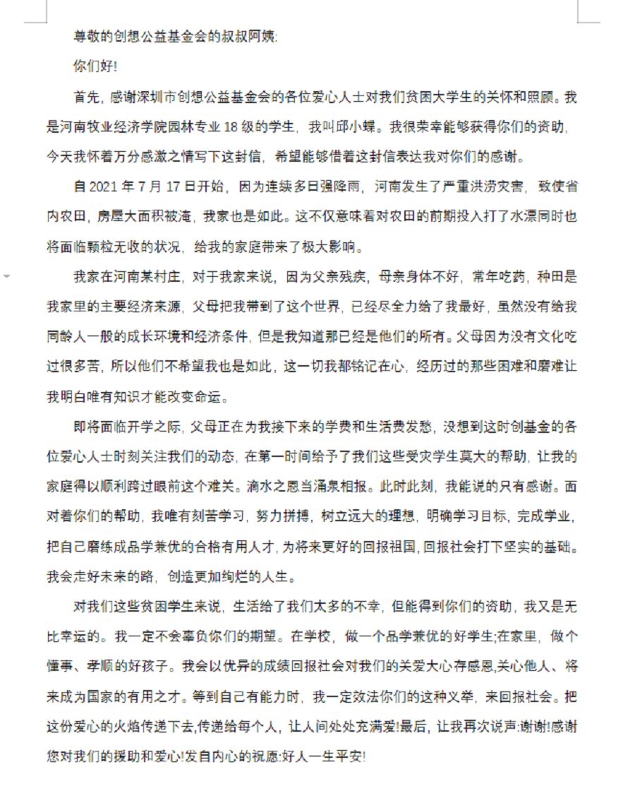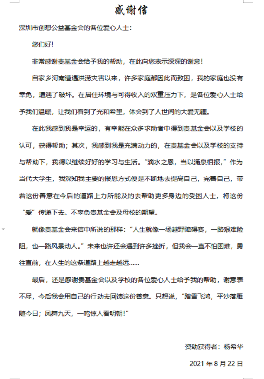 两名学生在收到资助款后,纷纷表示“滴水之恩,当以涌泉相报,会继续发奋努力学习,不断地去提高自己,完善自己,带着这份善意在今后的道路上力所能及的去帮助更多身边的受困人士,将这份“爱”传递下去。”并回致了感谢信。