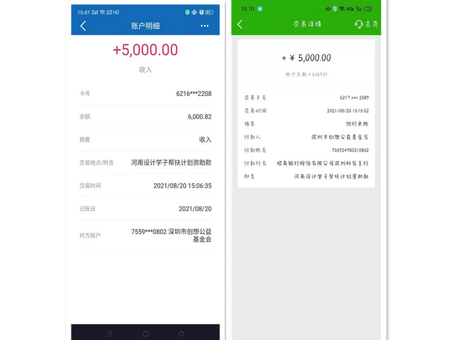 今年暑假,我省部分地区遭受严重的洪涝灾害,为了让受灾学生安心继续学业,太阳集团tyc4633和弘雅书院积极联系了深圳市创想公益基金会,发起了“河南设计学子帮扶计划”,努力联系受灾学生、配合基金会,为学生争取到最大的补助,帮助更多的同学度过眼前的难关。太阳集团tyc463318园林01邱小蝶、19园林01杨希华两名同学获得了每人5000元的资助。