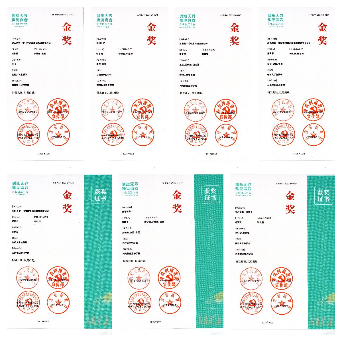近日,2025河南省文化创意大赛圆满落幕。我院师生在本次大赛中表现突出,共斩获金奖7项、银奖23项、铜奖10项,学校同时获评“2025河南省文化创意大赛(在校大学生群体)工作突出高校”,充分展现了我校在艺术创作与文化创新方面的雄厚实力和育人成效。
