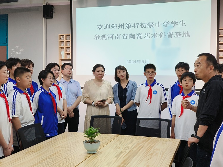 近日郑州第47初级中学学生参观河南省陶瓷艺术科普基地,陶瓷创研中心主任董晓峰老师现场为同学们科普陶瓷艺术知识。