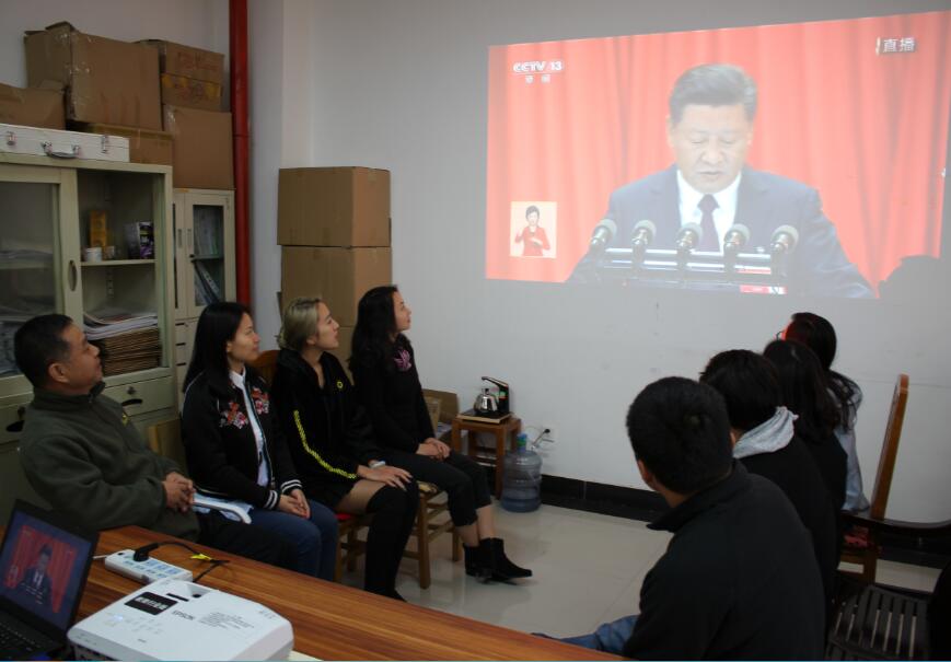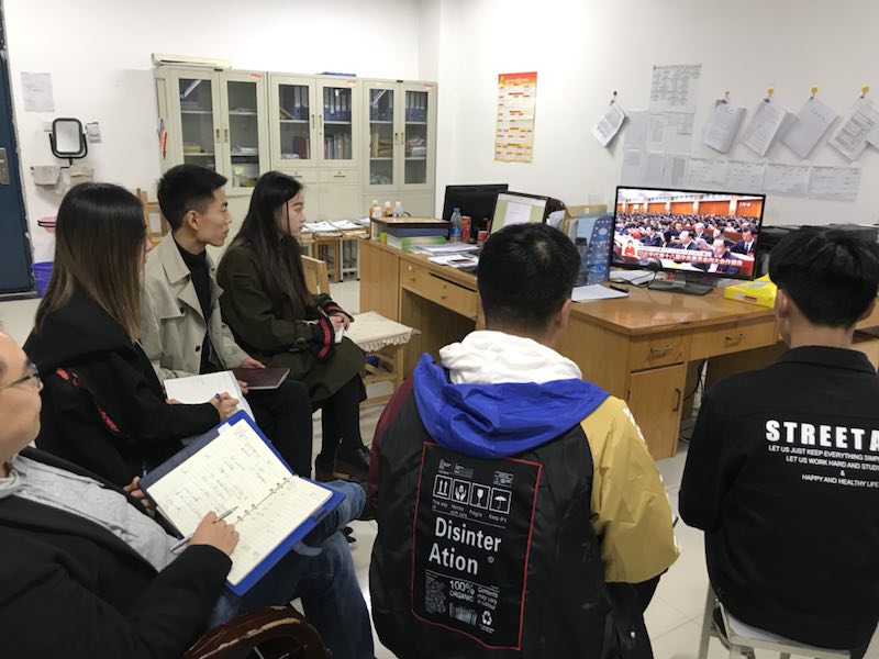 收看过程中,与会同志们全神贯注、聚精会神,不时将重点记录下来。校外考察的师生们在贾艳艳副书记的组织下,电脑、手机等多屏互动,他们通过各种形式专注收看收听十九大开幕会现场直播。会上,我院师生一致认为,习近平总书记的报告高瞻远瞩、内涵丰富、思想深刻、高屋建瓴、催人奋进。