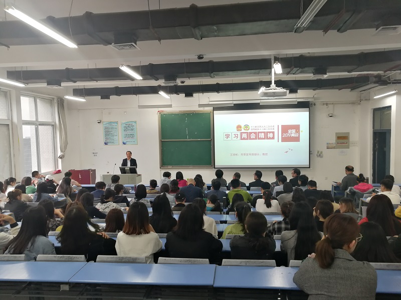 王凌彬部长首先从我国两会召开面临的国际国内大环境出发,深刻分析了当前世界正面临百年未有之大变局的国际大背景,热切展望了我国发展的大好形势。之后概括介绍了“两会”的总体情况和主要精神,结合政府工作报告,回顾了2018年政府主要工作,展望了2019年经济社会发展形势和宏观经济预期,重点解读了2019年政府工作任务及许多热点政策。王部长以奋斗创造历史、实干成就未来作为结束语,勉励大家努力工作、努力学习,以优异的成绩为学校的发展、国家的发展贡献力量。