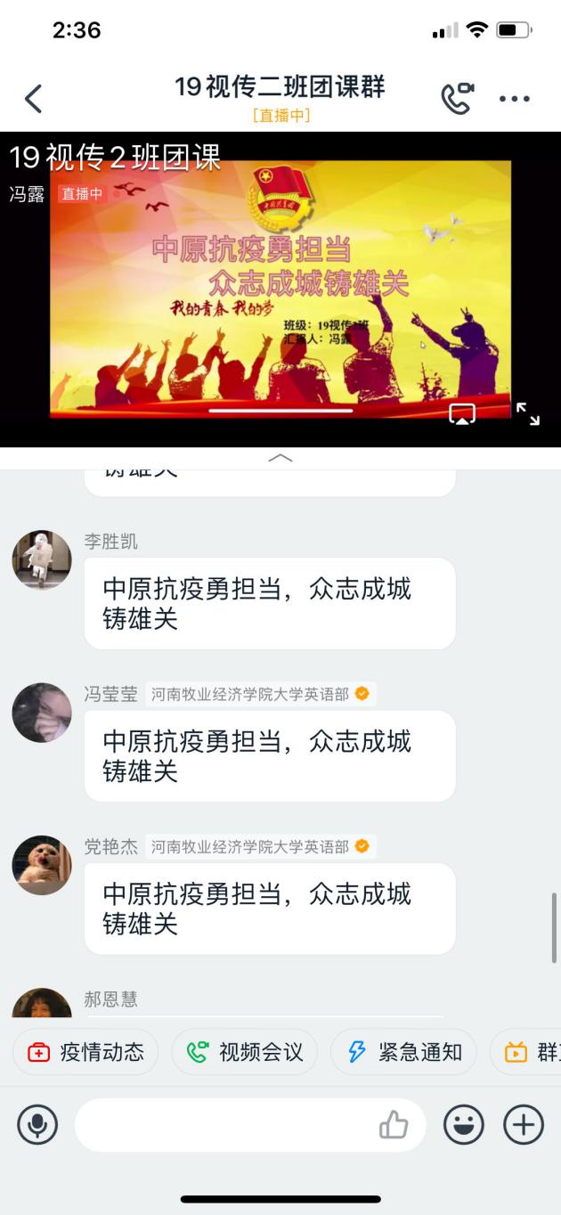 2020年5月14日下午,太阳集团tyc4633在钉钉会议群上举行了以“中原抗疫勇担当,众志成城铸雄关”为主题的团课。本次团课,由大一全体班级参加。