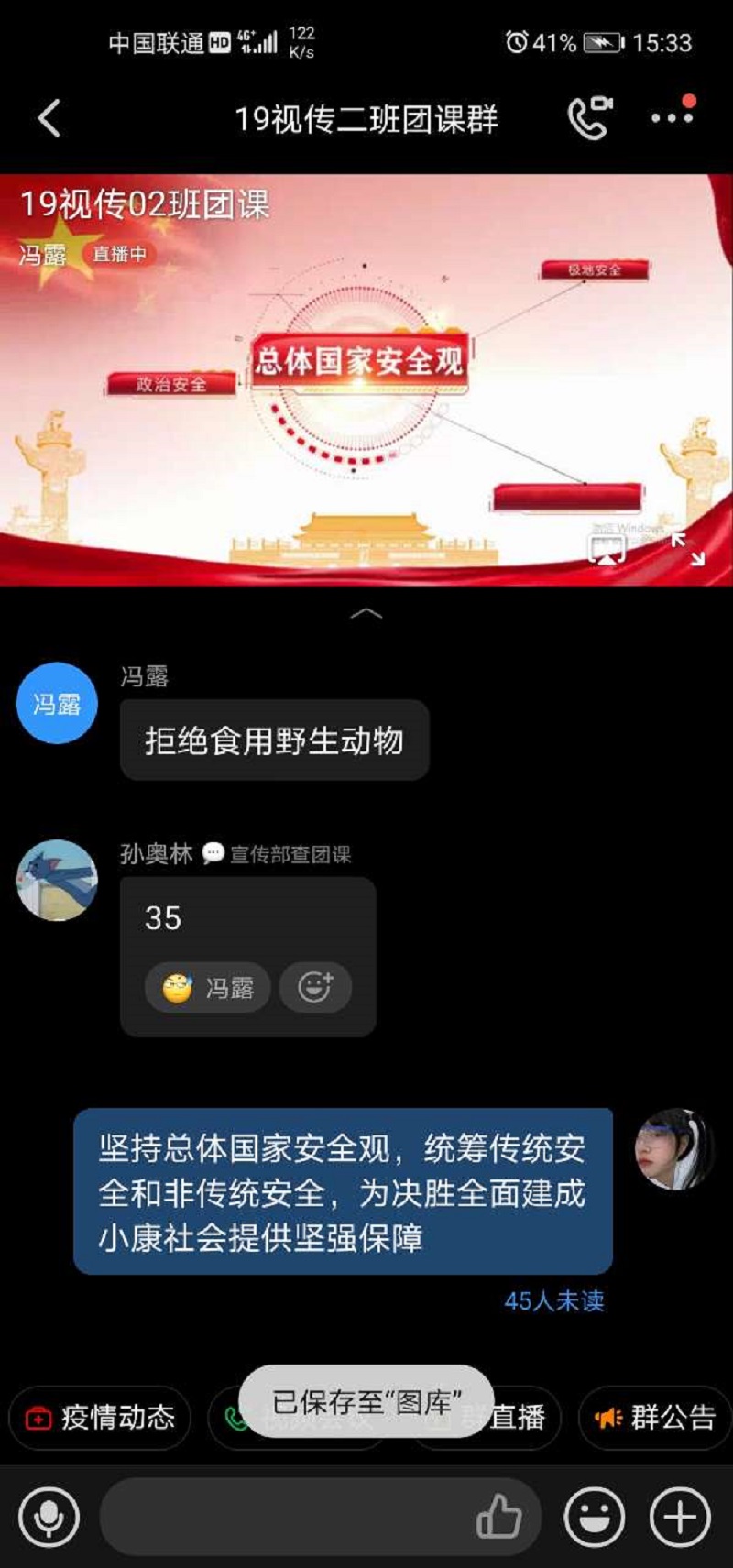 2020年4月15日下午,太阳集团tyc4633在钉钉会议上举行了以“维护国家安全,青年勇于担当”为主题的团课,本次团课,由大一全体班级参加。