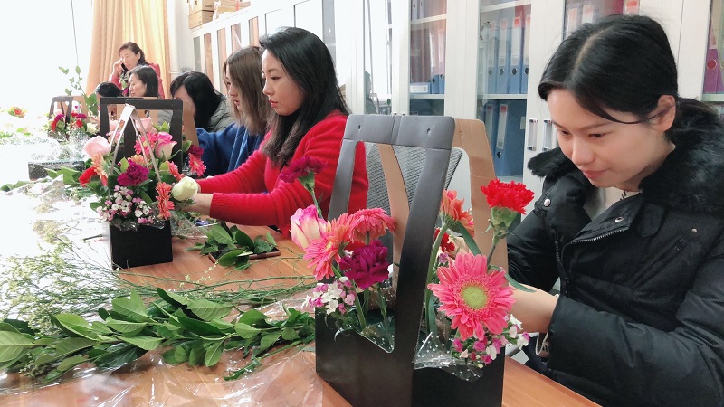 学院邀请专业花艺师为我院女教工开展现场插花教学,讲解插画艺术与技巧,并一对一指导现场教师进行插花活动。在花艺师的指导下,老师们挑选自己喜欢的花卉,自由发挥,进行创作,还不时观摩其他老师们的作品,互相交流,活动气氛十分活跃。同时,学院分工会为所有女教职工精心准备了精美花束以庆祝三八“妇女节”的到来。