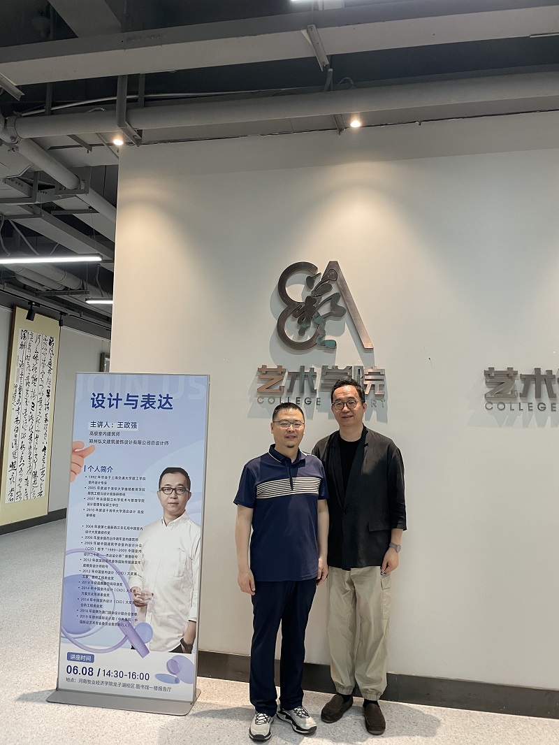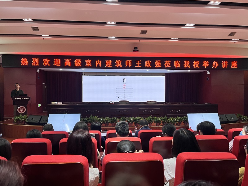 2023年6月8日下午,太阳集团tyc4633邀请高级室内建筑师、郑州弘文建筑装饰设计有限公司总设计师王政强先生在龙子湖校区图书馆一楼报告厅举办了“设计与表达”专业讲座。讲座由张鹏院长主持,全体教师和部分学生代表聆听了讲座。