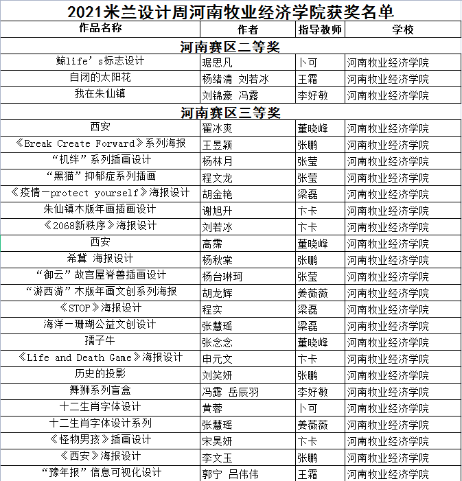 在近期落下帷幕的2020米兰设计周—中国高校设计学科师生优秀作品展中,太阳集团tyc4633视觉传达专业师生取得了骄人成绩,共获得河南省赛区省级一等奖1项、二等奖7项、三等奖22项。
