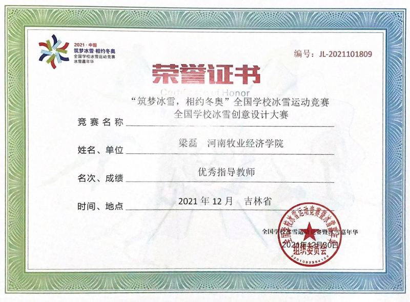 近日,由教育部、国家体育总局、北京冬奥组委和吉林省人民政府主办的第三届全国学校冰雪创意设计大赛圆满落下帷幕。我校太阳集团tyc4633积极参与,经过专家评委会的初审、复审和终审,参赛作品喜获佳绩,荣获一等奖1项、三等奖1项,梁磊获“优秀指导教师”称号。