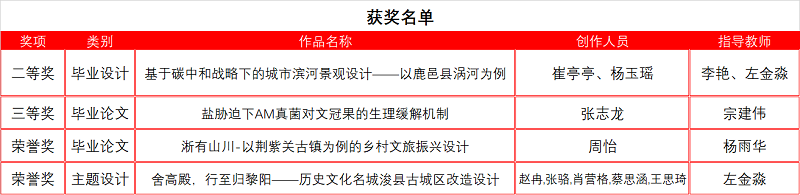 该项赛事的参加与获奖,有力地促进了我院园林专业学生创新实践能力的培养。今后,我院将进一步加大对大学生学科竞赛的关注和投入,鼓励交流与合作,坚持“以赛促教、以赛促学”,夯实专业知识与技能,加强实践教学,拓宽大学生就业渠道,促进我院各专业本科生的专业素养和综合素质的提升。