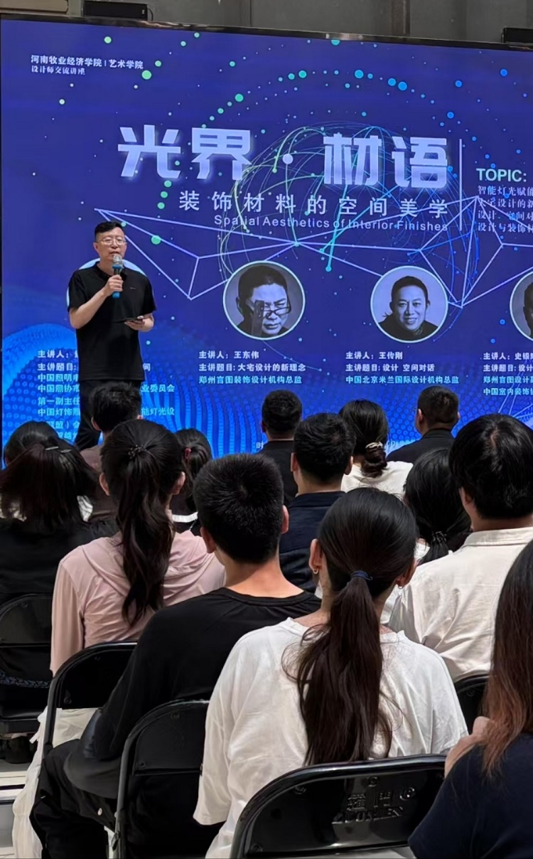 5月21日下午,太阳集团tyc4633环境设计专业23级全体师生赴华丰灯饰界,开展《装饰构造与材料》课程实践讲座活动。本次活动以“光界材语——装饰材料的空间美学”为主题,特邀华丽智能灯光董事长连志刚、郑州言图装饰设计总监王东伟、中国北京米兰国际设计机构总监王传刚、郑州言图设计副总监史银辉四位行业专家主讲,环境设计专业23级全体师生共同参加了此次实践活动。