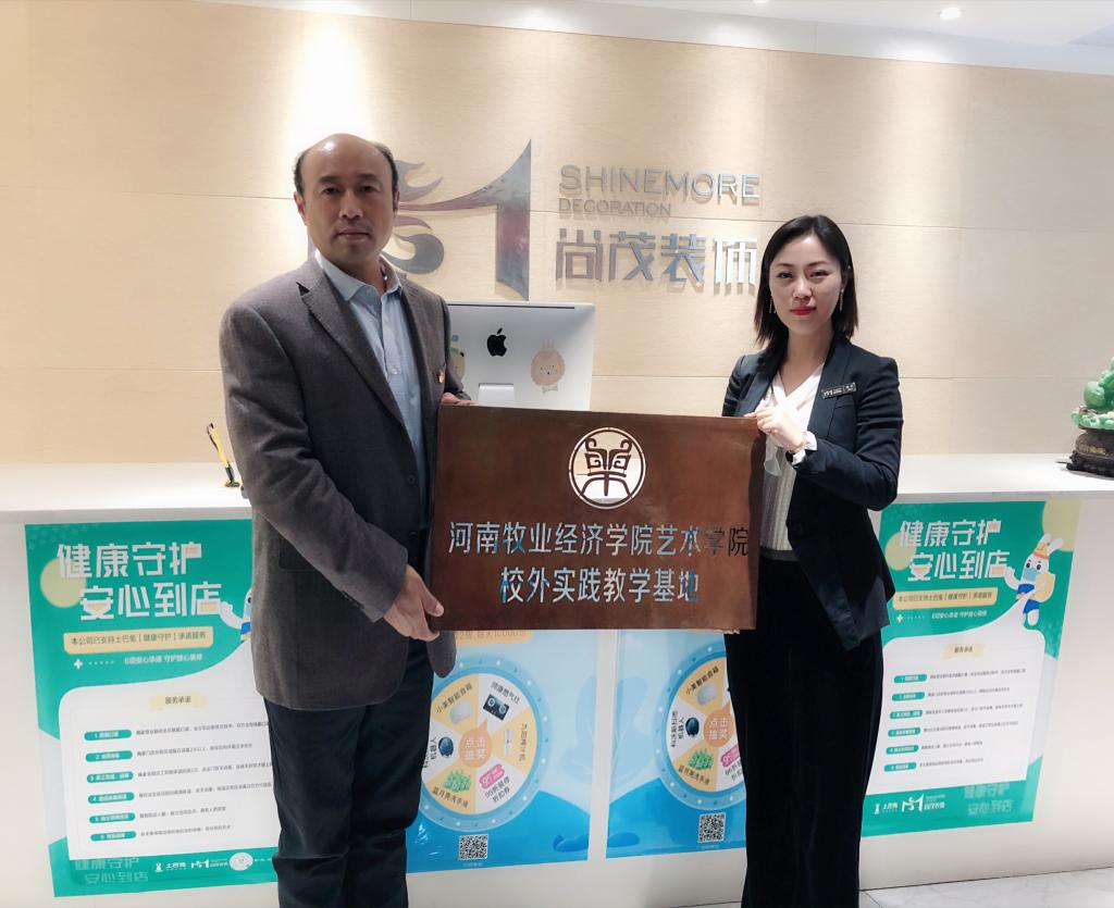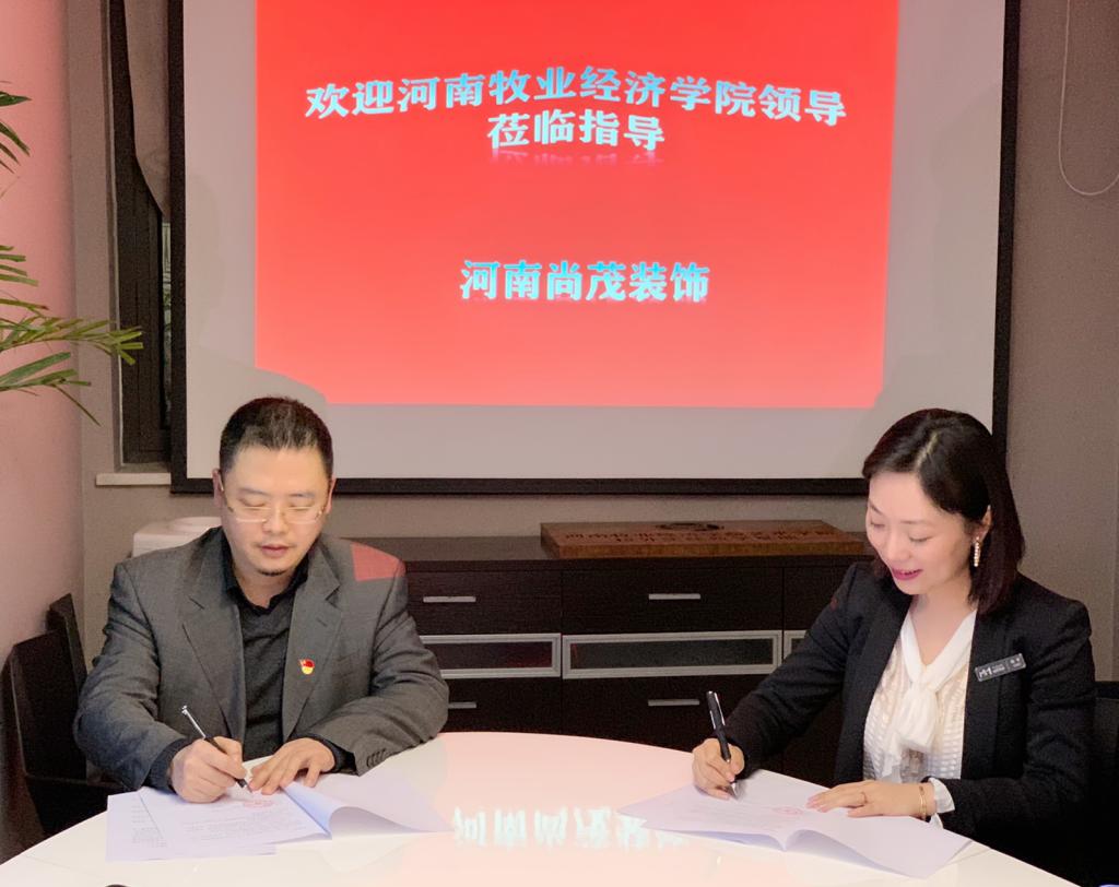 为深入推进产学结合教学模式的运行,为学生提供良好的实训实习平台,2020年4月24日下午,太阳集团tyc4633与河南尚茂装饰工程有限公司校企合作签约仪式在尚茂公司举行,尚茂公司总经理刘进婷、设计总监张大磊、太阳集团tyc4633王在钦书记、张鹏院长、田志涌副院长、环境设计教研室主任谭丛、副主任李莉参加签约挂牌仪式。